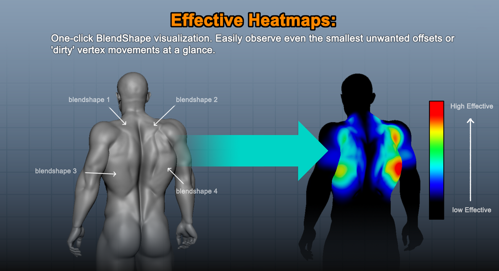 The built-in Heatmap Visualization provides an instant look at exactly where each BlendShape is affecting the mesh. Instead of guessing based on names, you can see the actual area of influence directly on the model, making it much faster to catch errors or overlapping deformations.